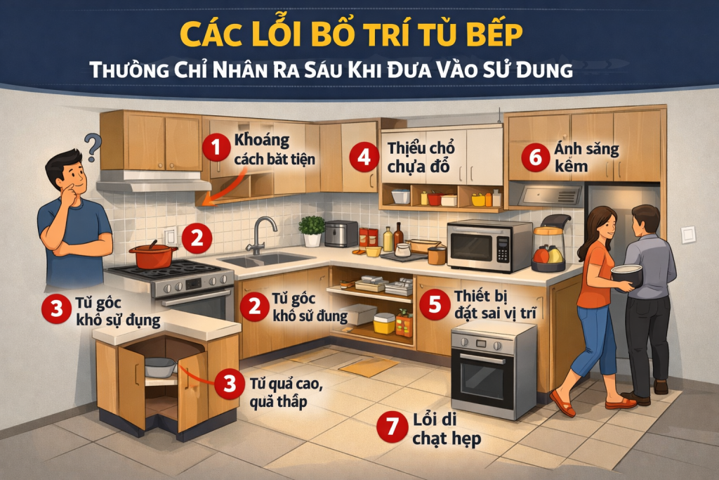 Bố trí tủ bếp không chỉ ảnh hưởng đến thẩm mỹ mà còn quyết định trực tiếp đến trải nghiệm sử dụng lâu dài. Những lỗi nhỏ trong thiết kế ban đầu có thể gây bất tiện lớn khi đưa vào sử dụng và khó khắc phục nếu không cải tạo lại toàn bộ hệ tủ.